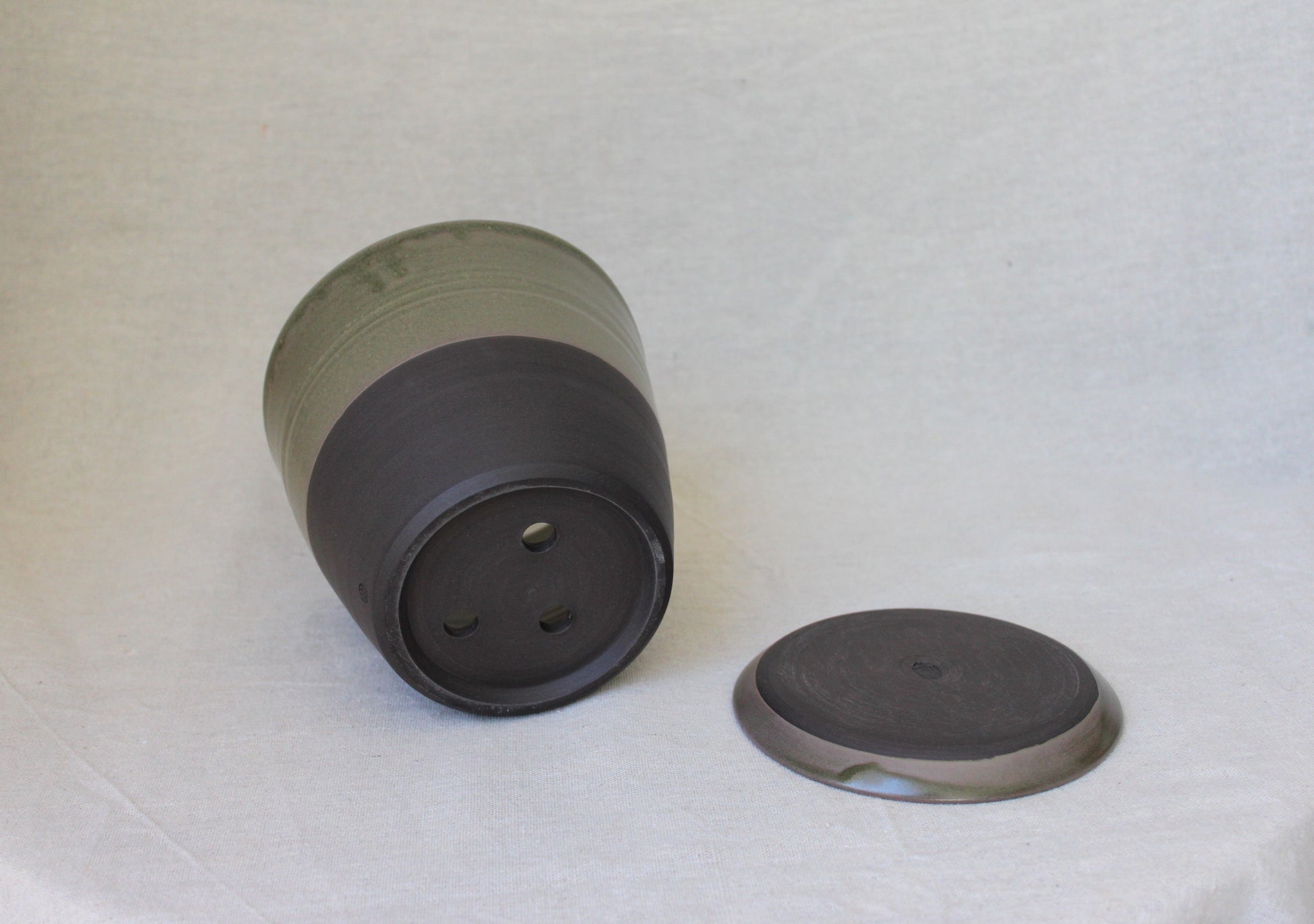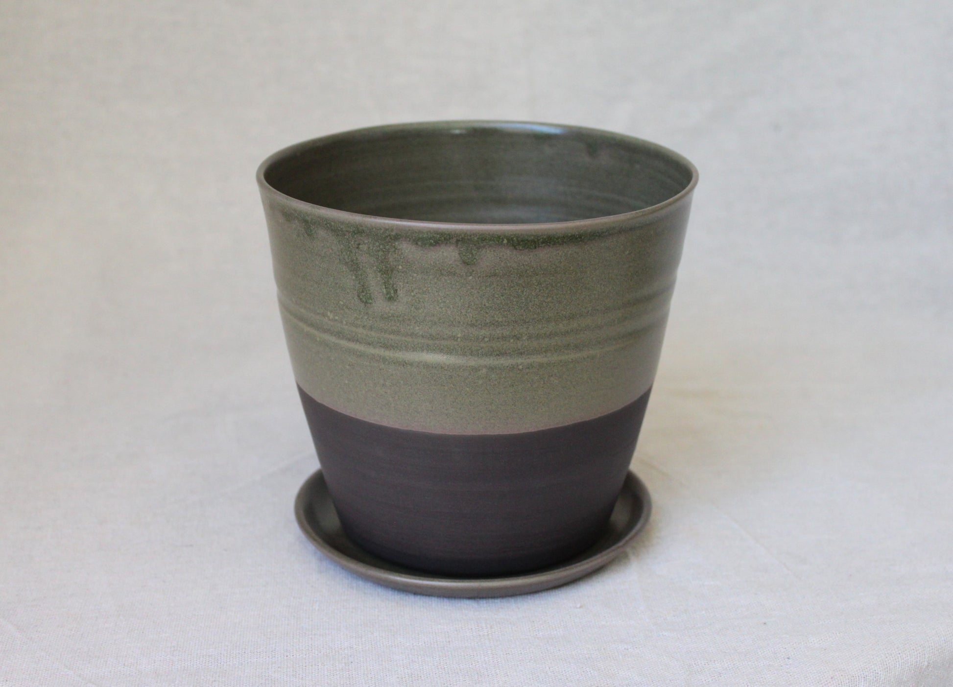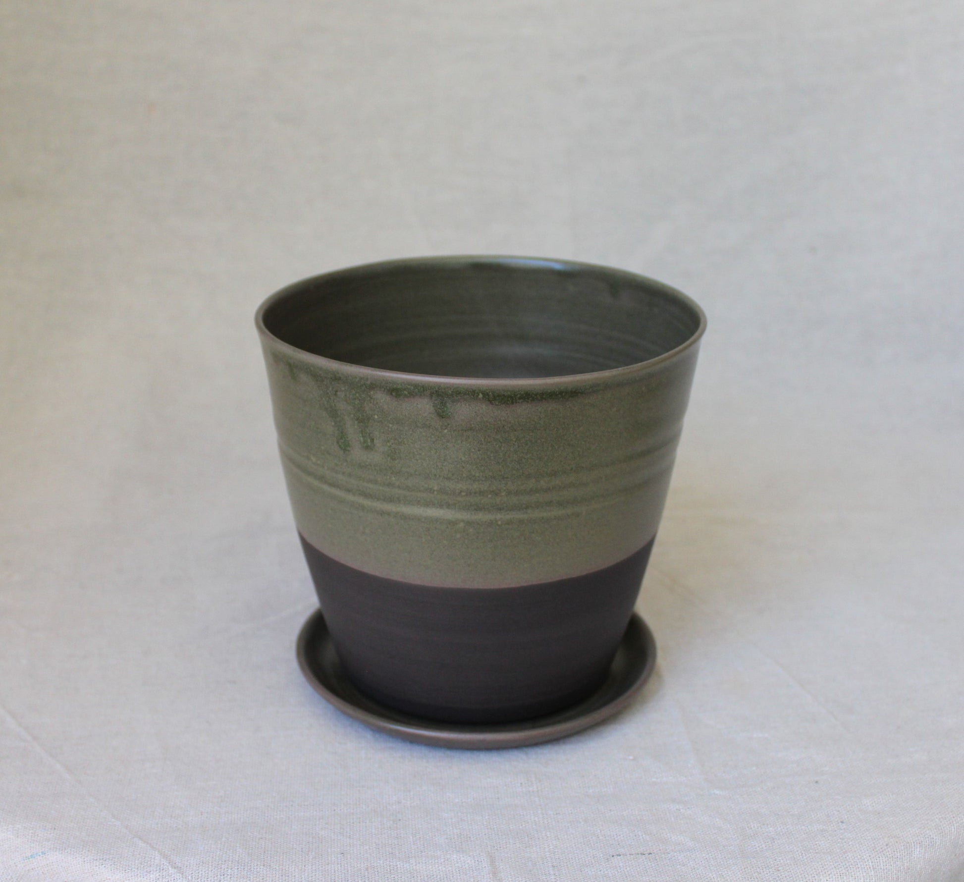 Handmade ceramic planter with saucer, crafted using locally sourced commercial black color clay, thrown on a pottery wheel, and finished with a green lead-free glaze and fired to 1210℃ for a smooth satin surface. The bottom part is left with bare clay which created visual interest.