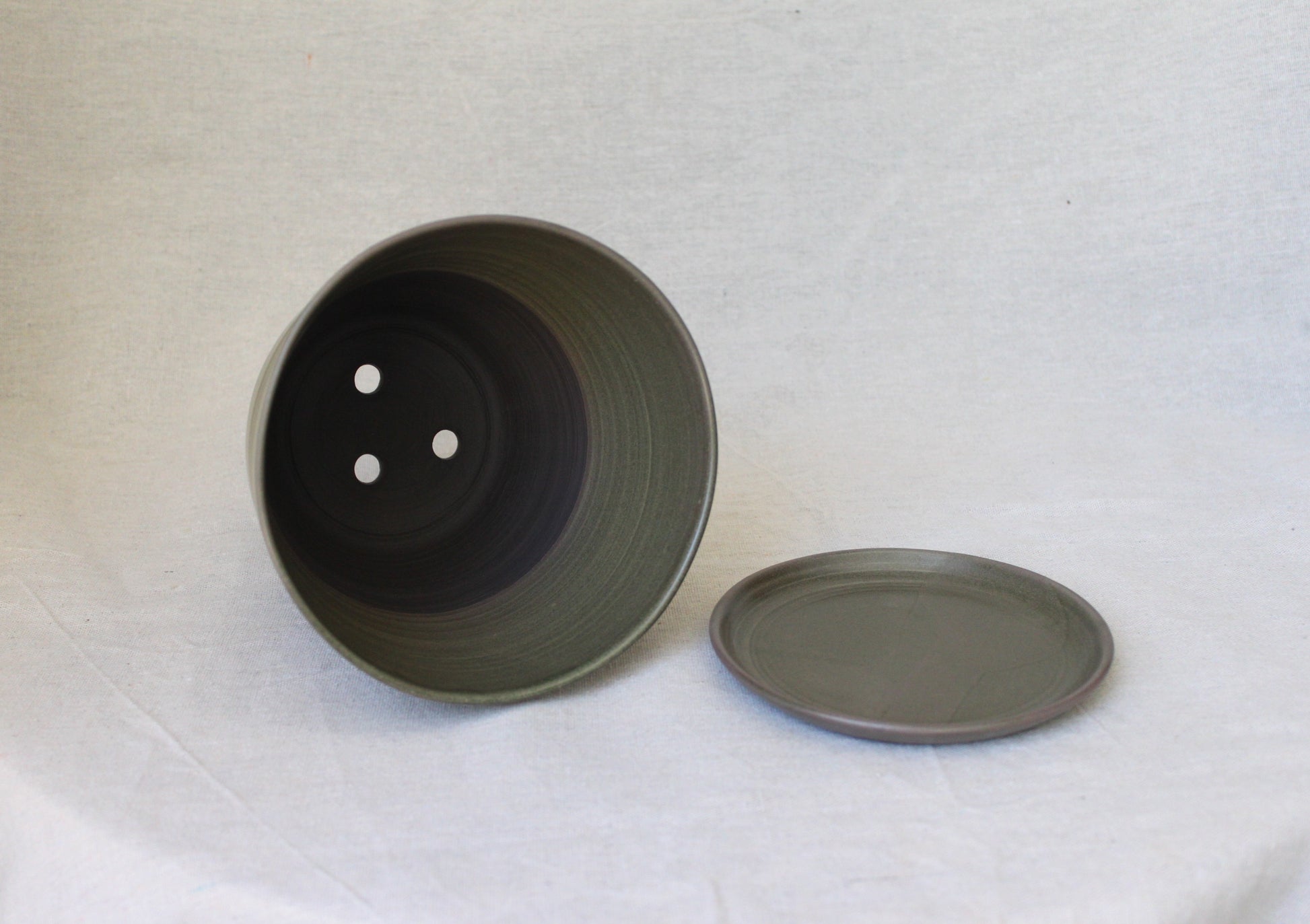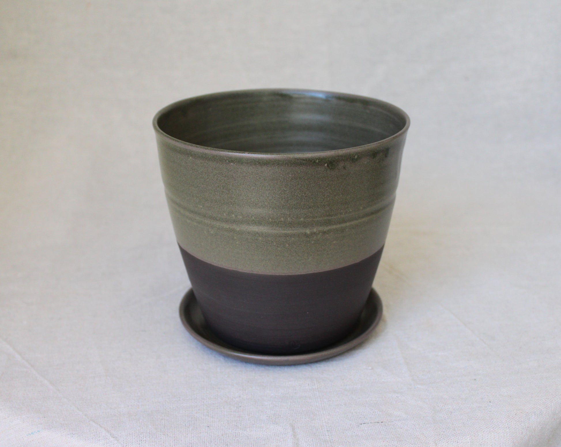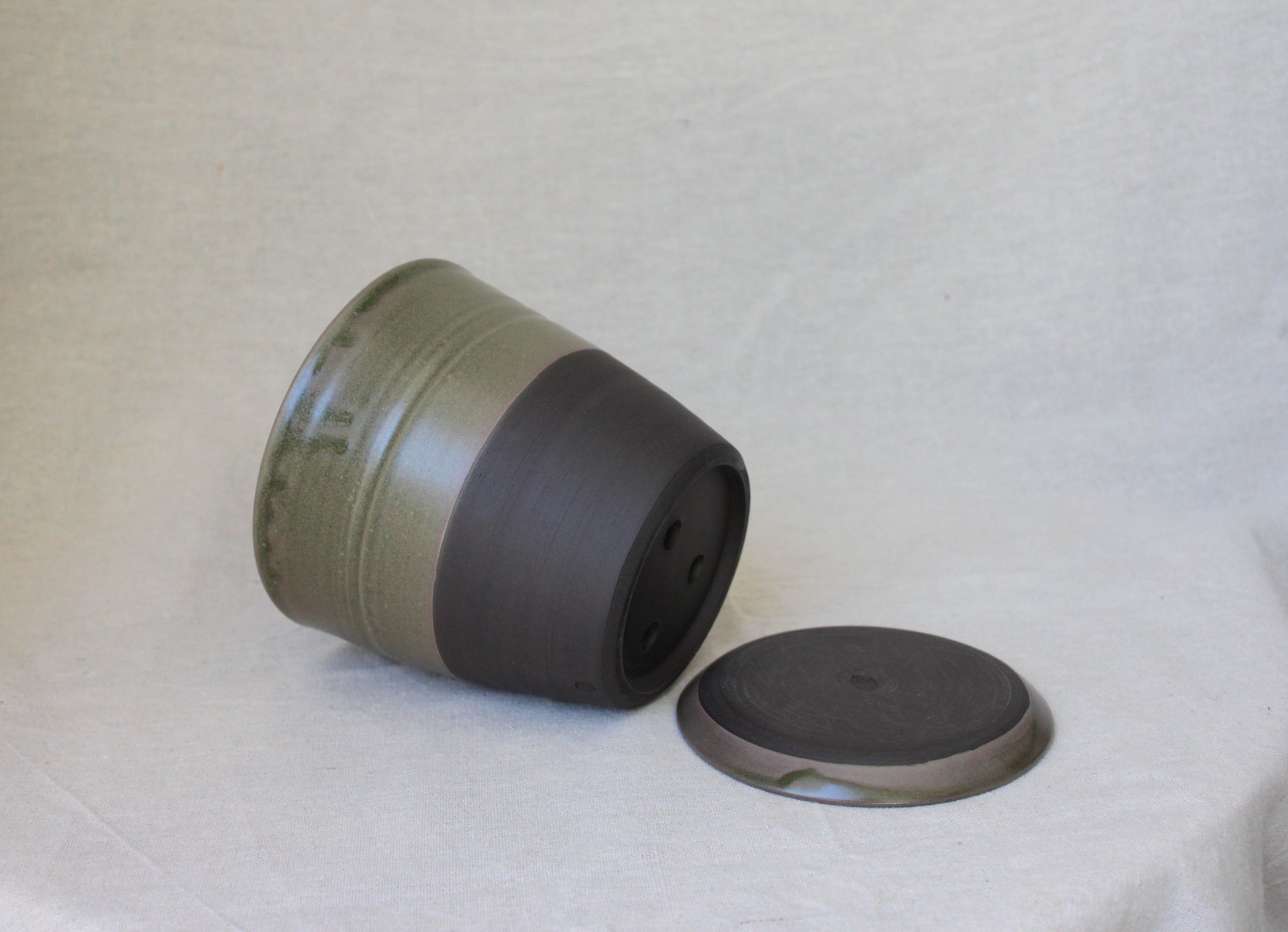 Handmade ceramic planter with saucer, crafted using locally sourced commercial black color clay, thrown on a pottery wheel, and finished with a green lead-free glaze and fired to 1210℃ for a smooth satin surface. The bottom part is left with bare clay which created visual interest.