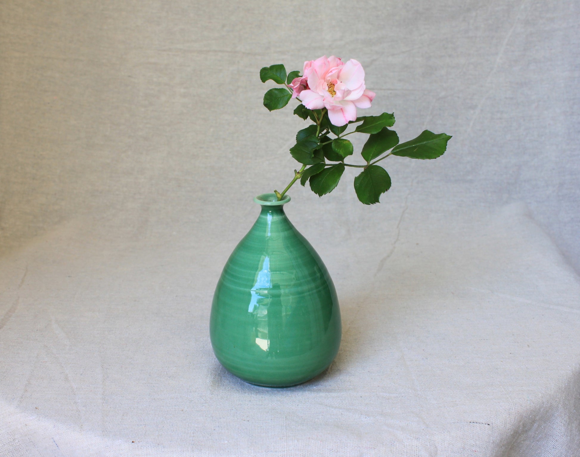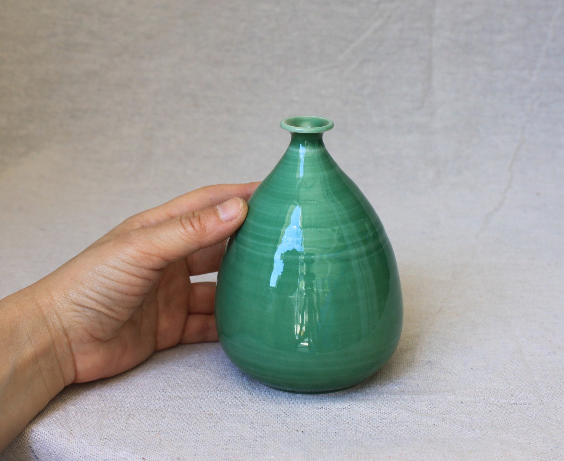 Handmade porcelain bud vase crafted using locally sourced commercial porcelain clay, thrown on a pottery wheel, finished with a lead-free green celadon glaze and fired to 1200°C.