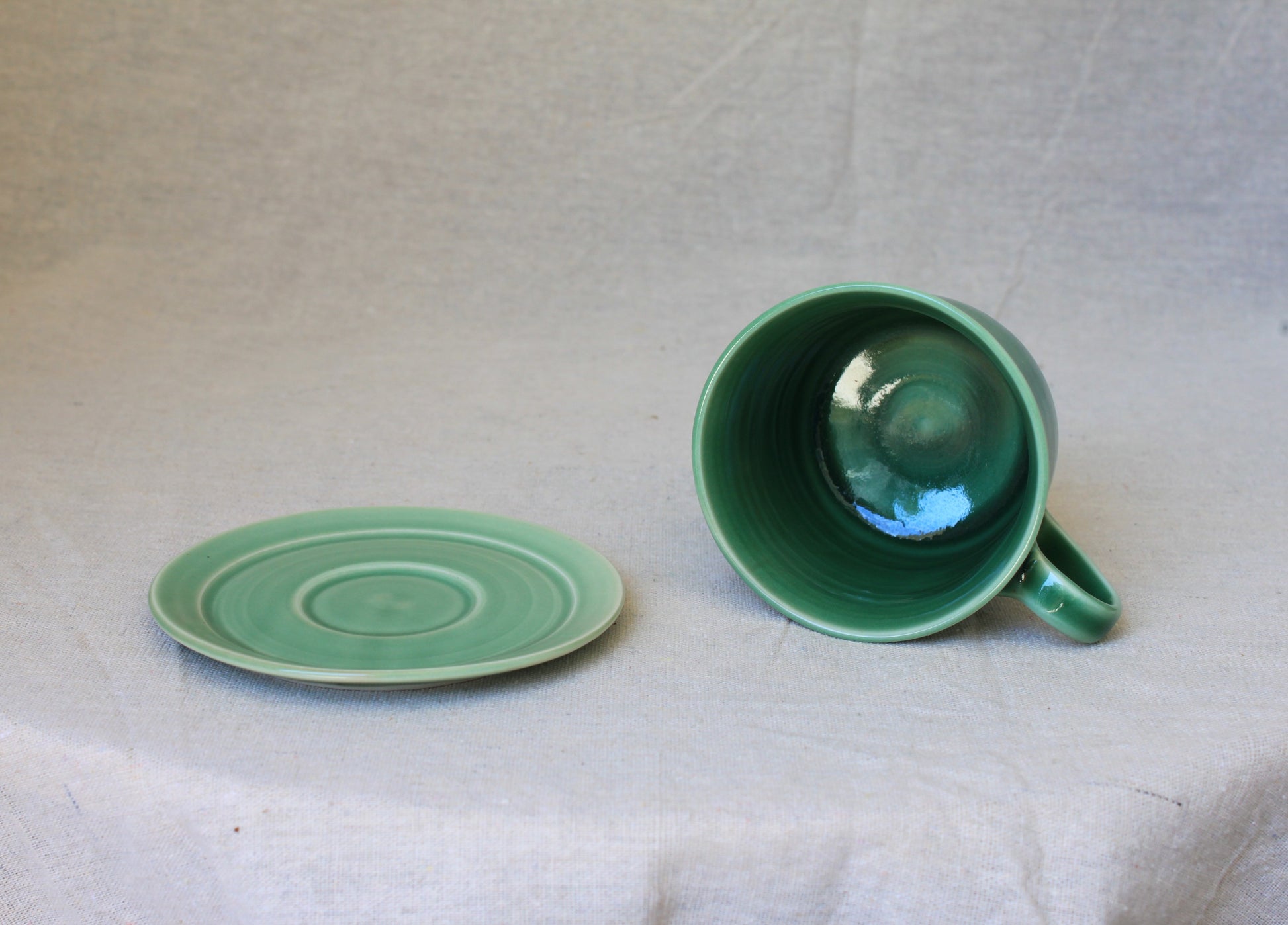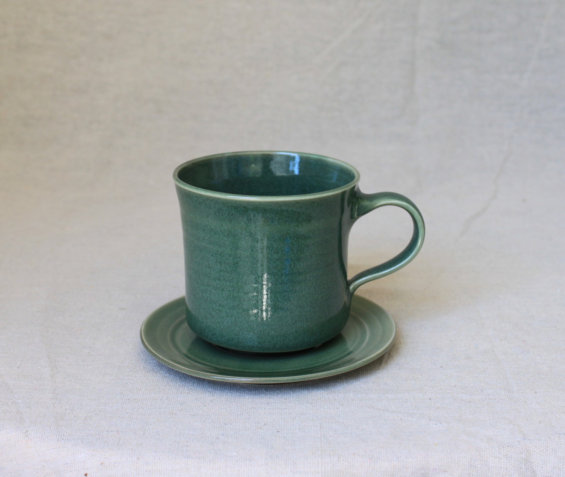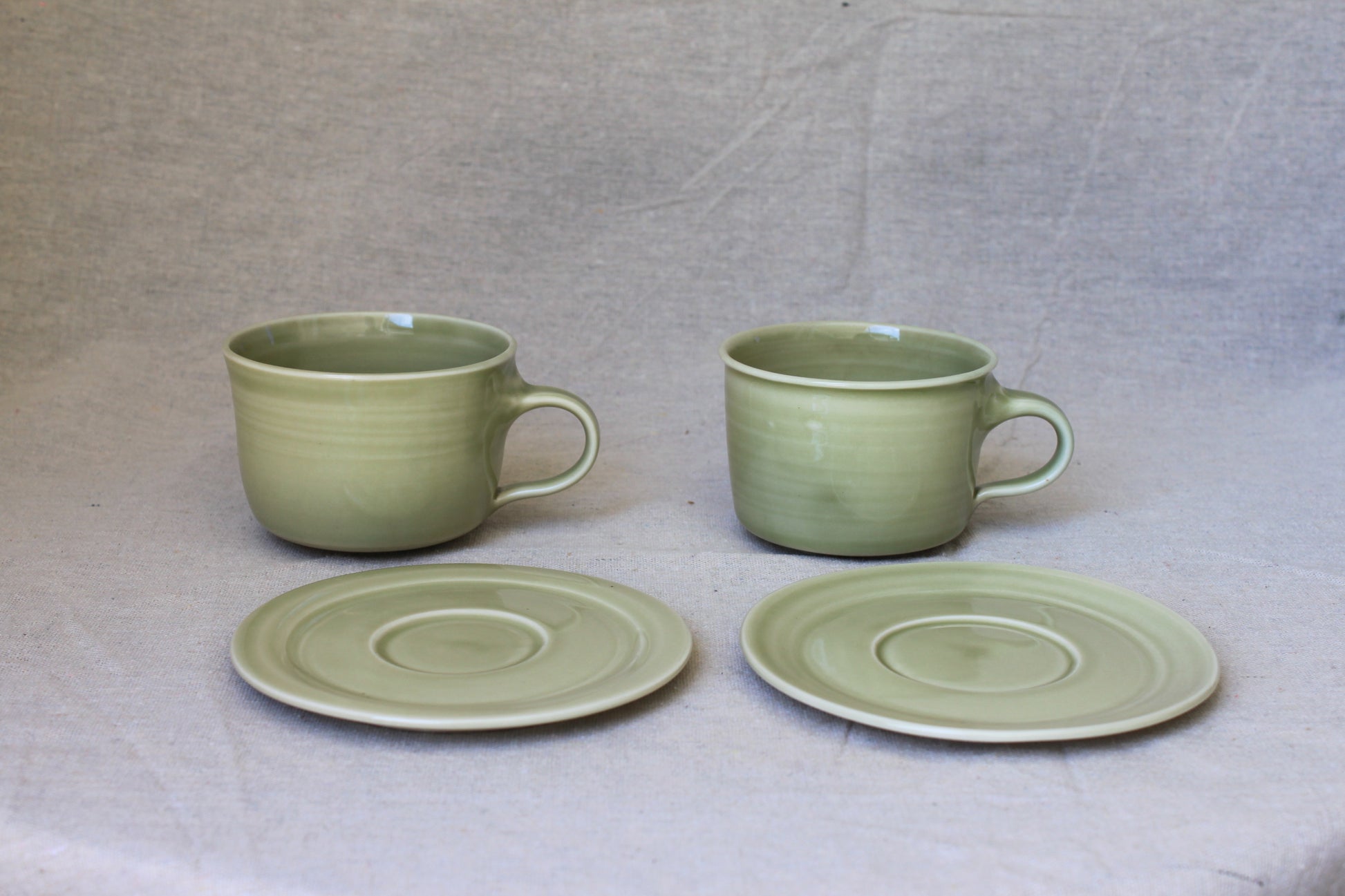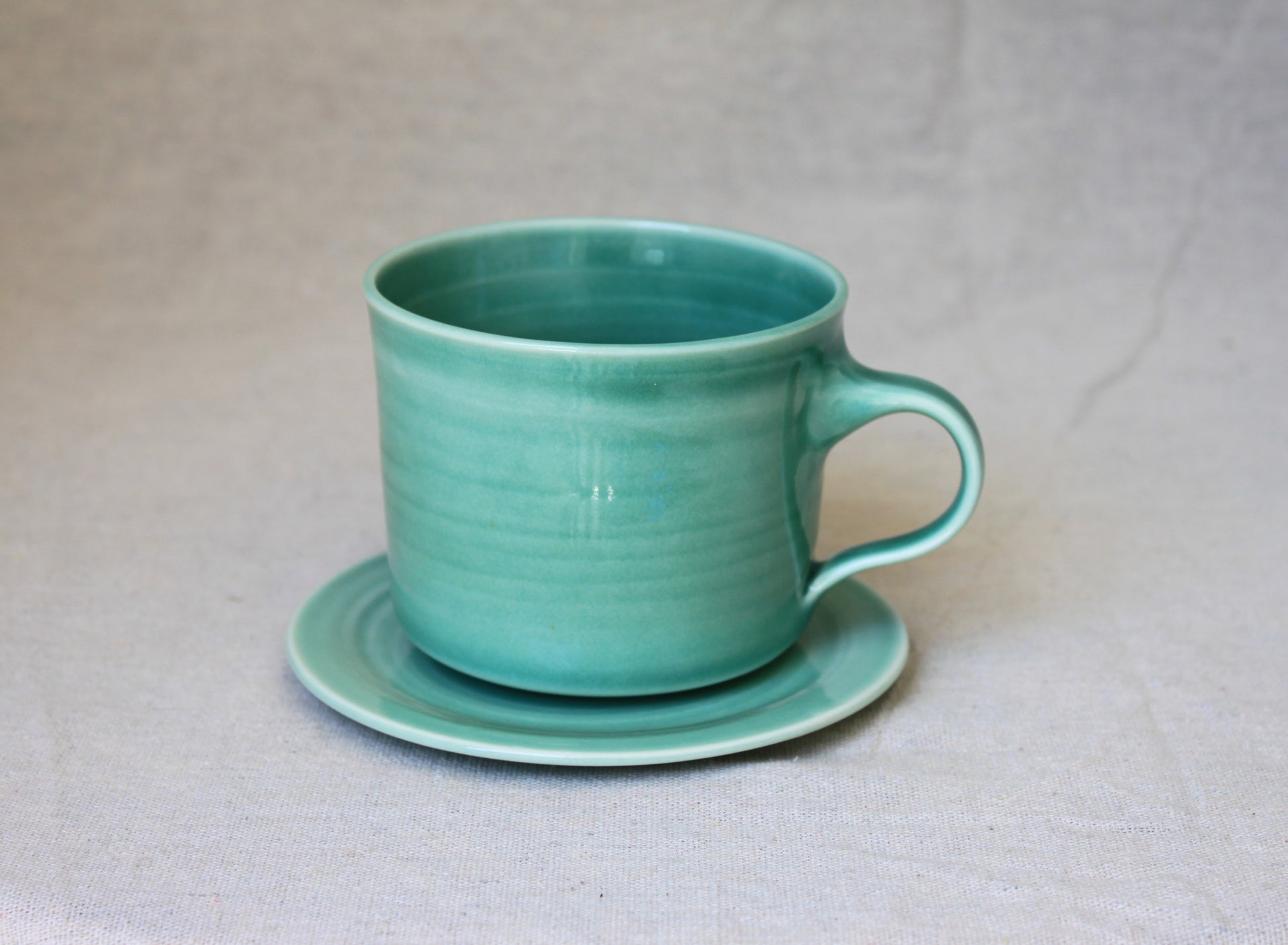 Handmade ceramic coffee mugs, crafted using locally sourced commercial porcelain clay, thrown on a pottery wheel, handle pulled on each mug, and finished with celadon green, lead-free, food-safe glazes for a smooth glossy surface. Fired to 1210℃, ensuring both food safety and dishwasher compatibility.