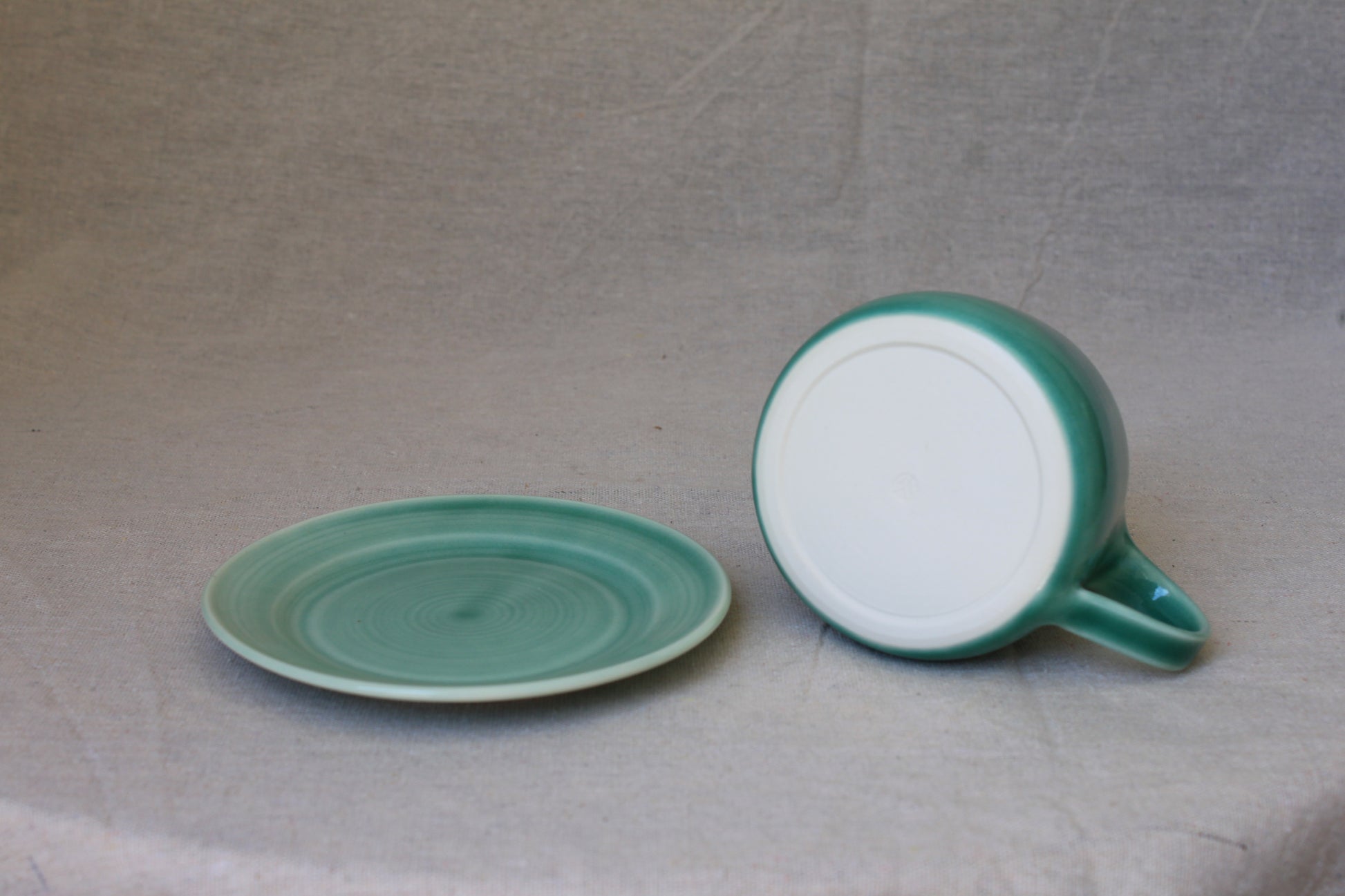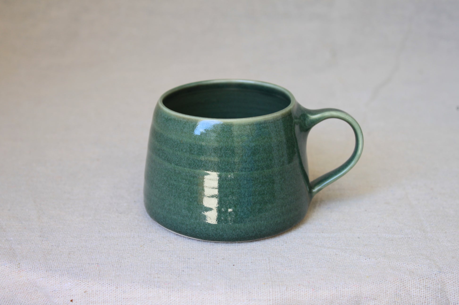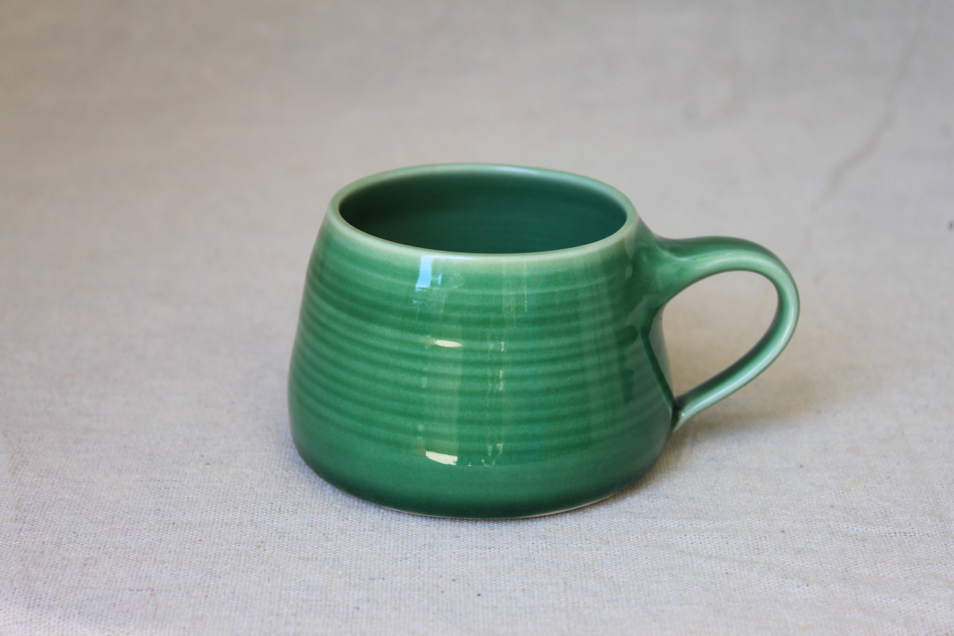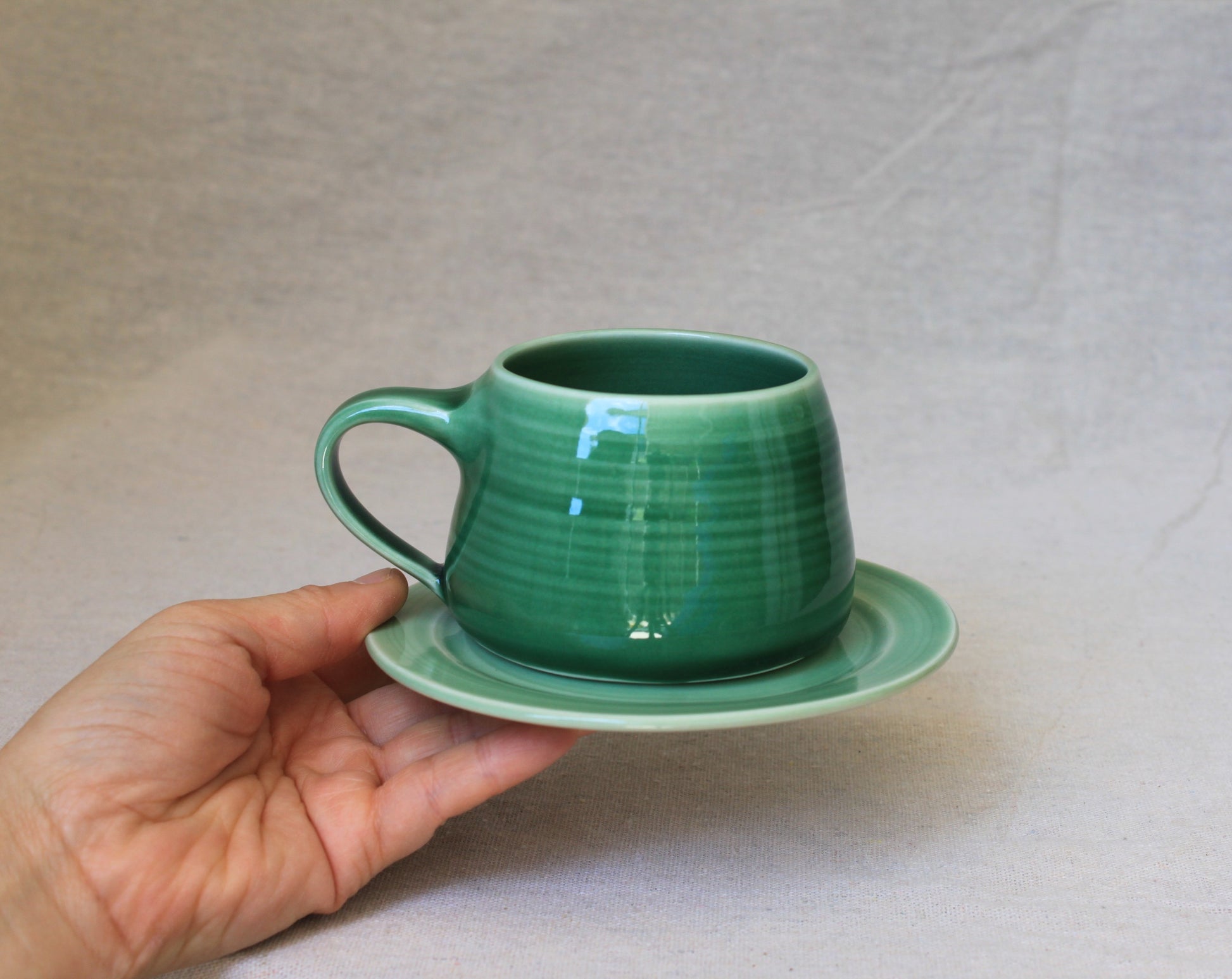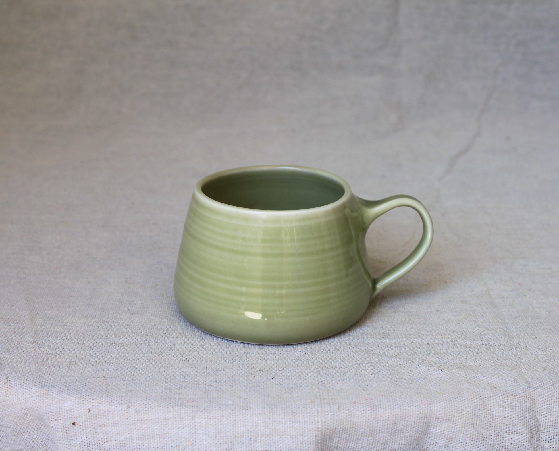 Handmade ceramic coffee mugs, crafted using locally sourced commercial porcelain clay, thrown on a pottery wheel, handle pulled on each mug, and finished with celadon green, lead-free, food-safe glazes for a smooth glossy surface. Fired to 1210℃, ensuring both food safety and dishwasher compatibility.