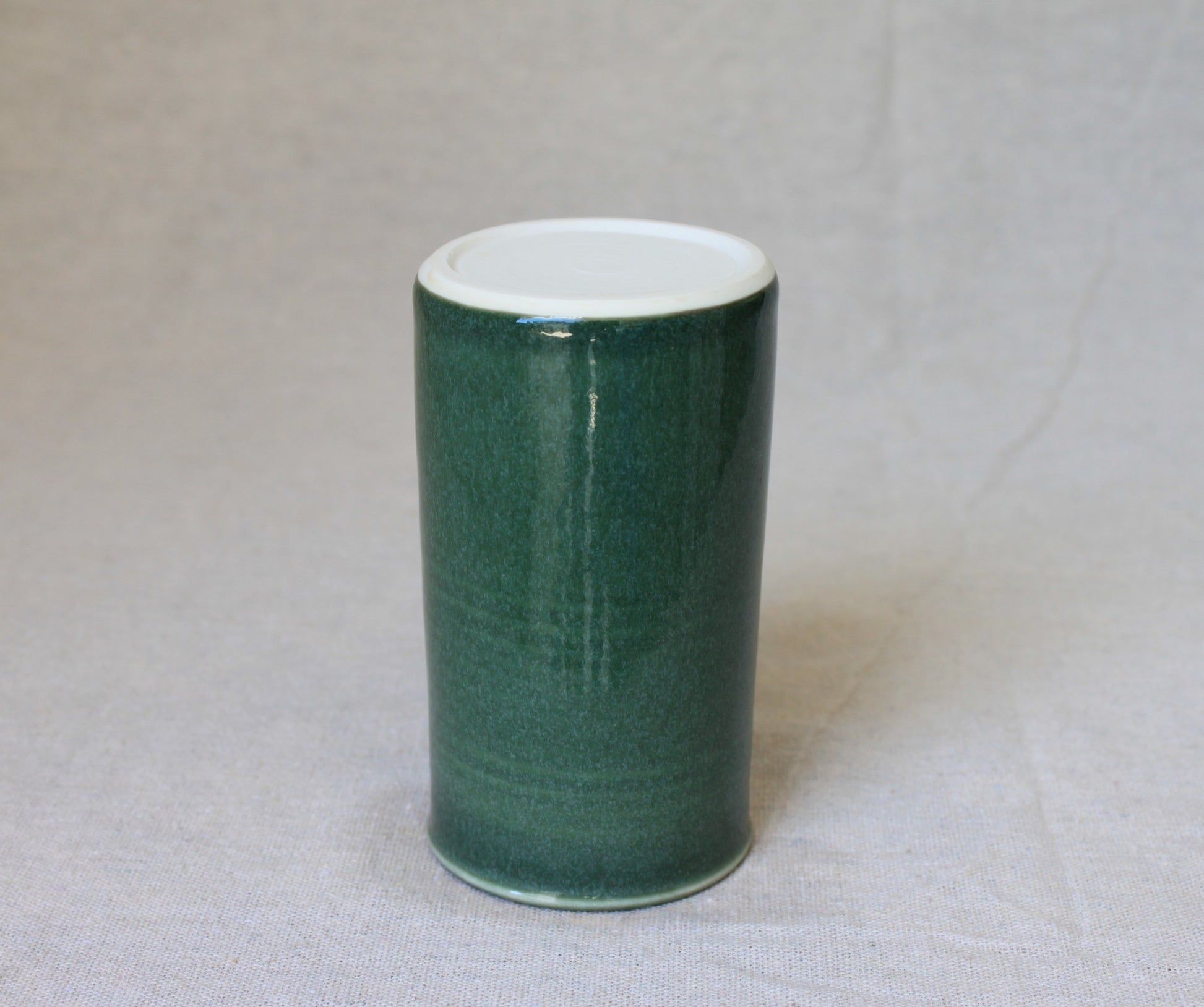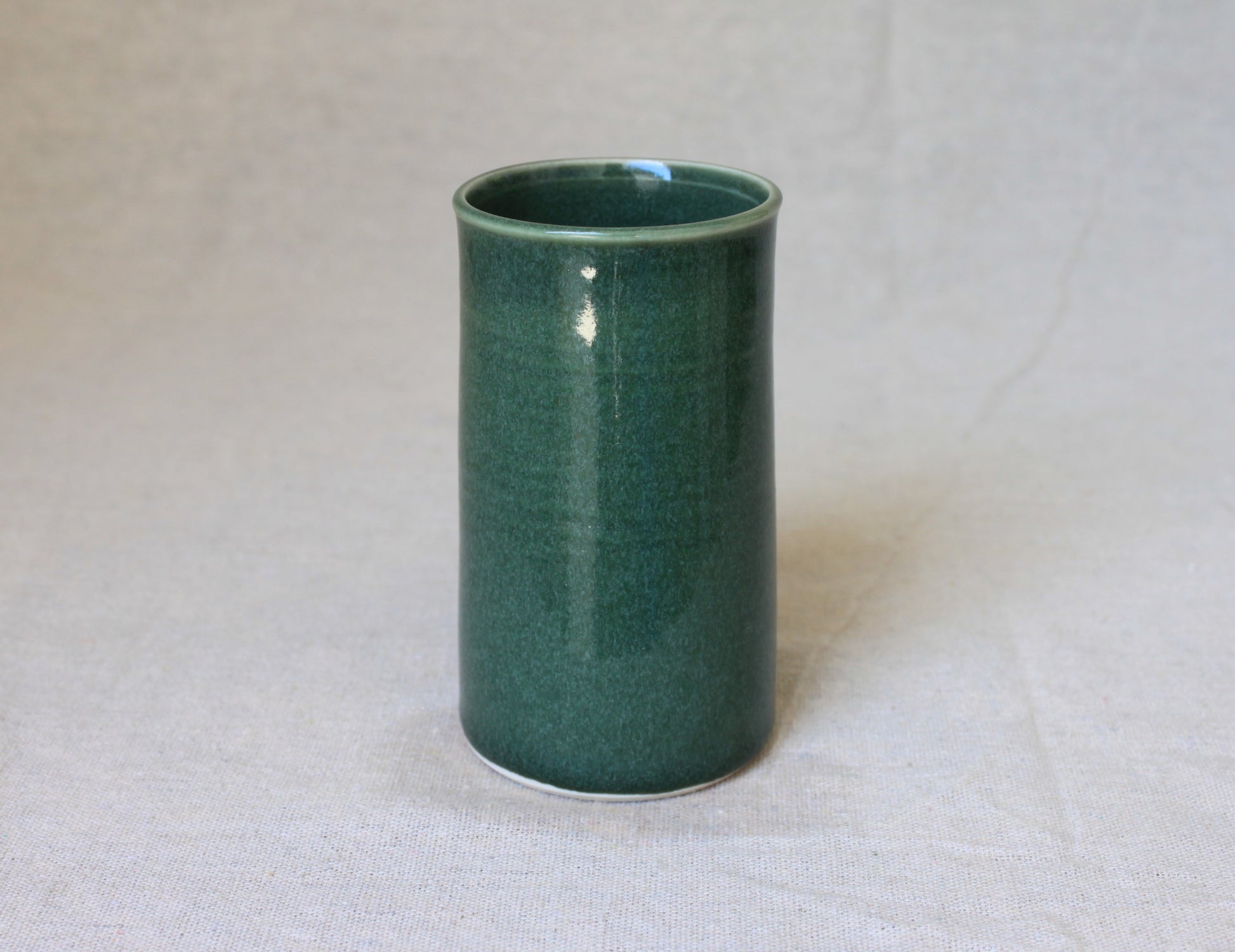 Handmade porcelain bud vase crafted using locally sourced commercial porcelain clay, thrown on a pottery wheel, finished with a lead-free dark green celadon glaze and fired to 1200°C.